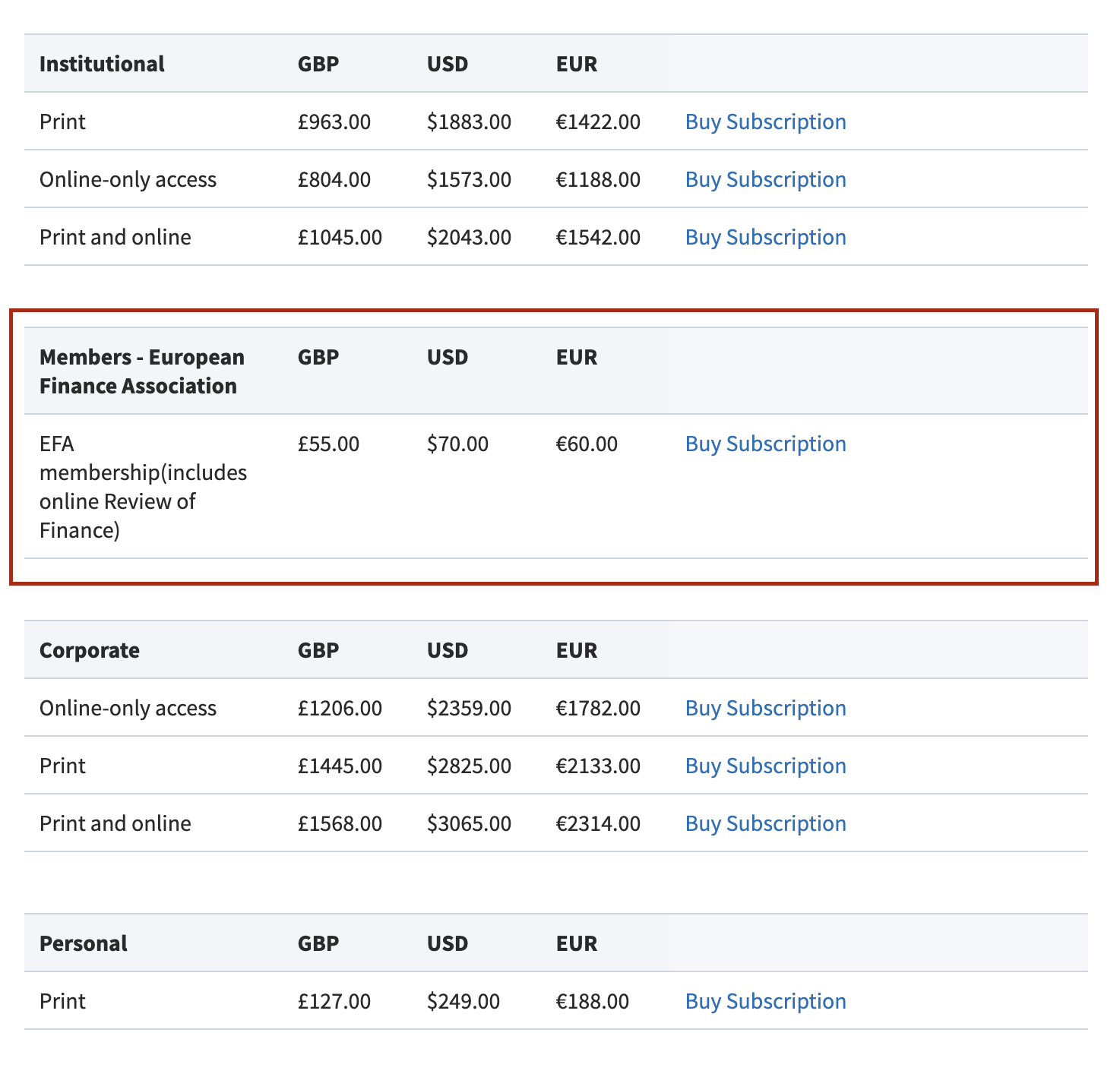 The EFA annual membership fee is €60 per calendar year – including VAT/GST and a personal online subscription to the association’s journal, the Review of Finance.